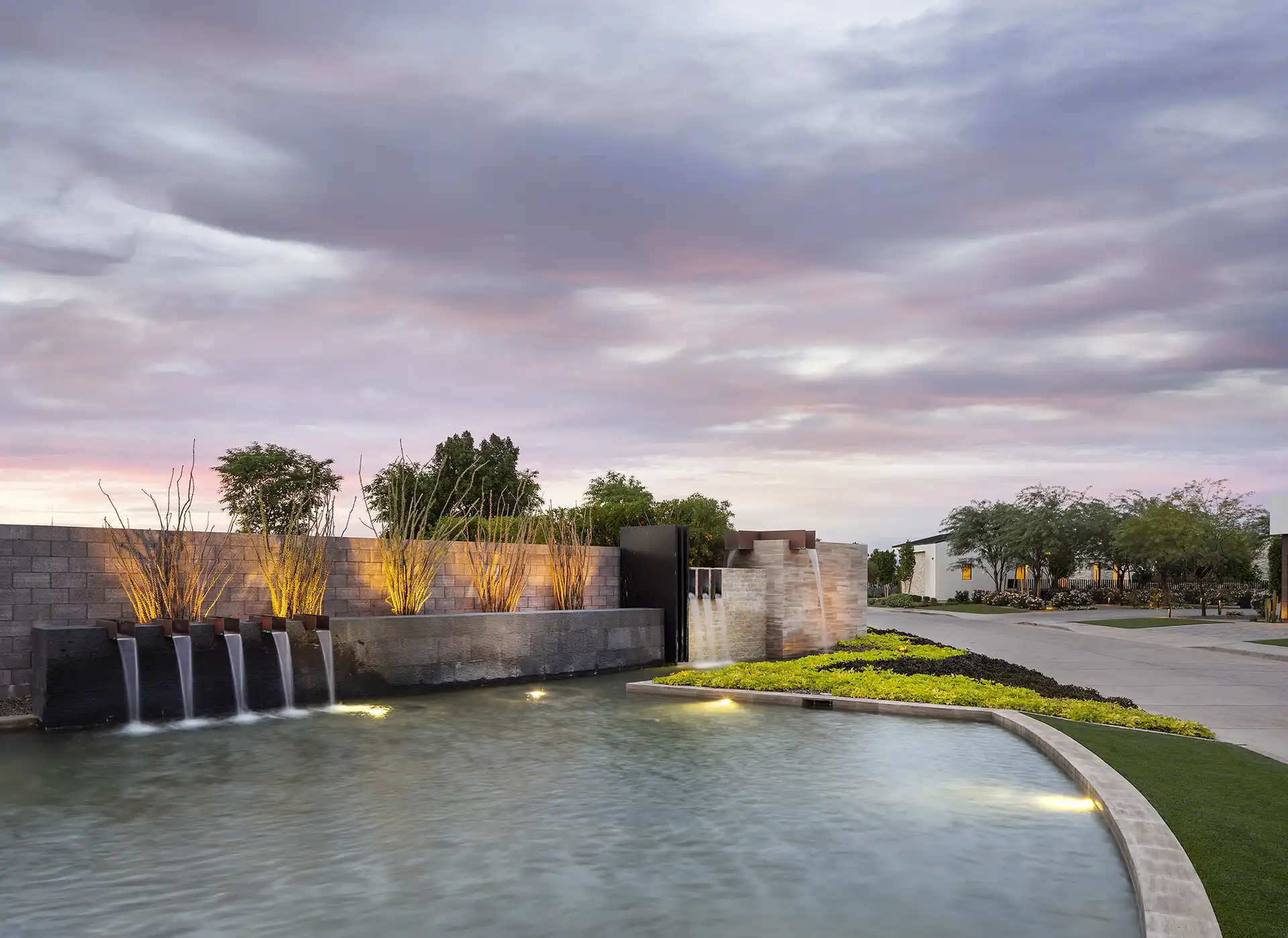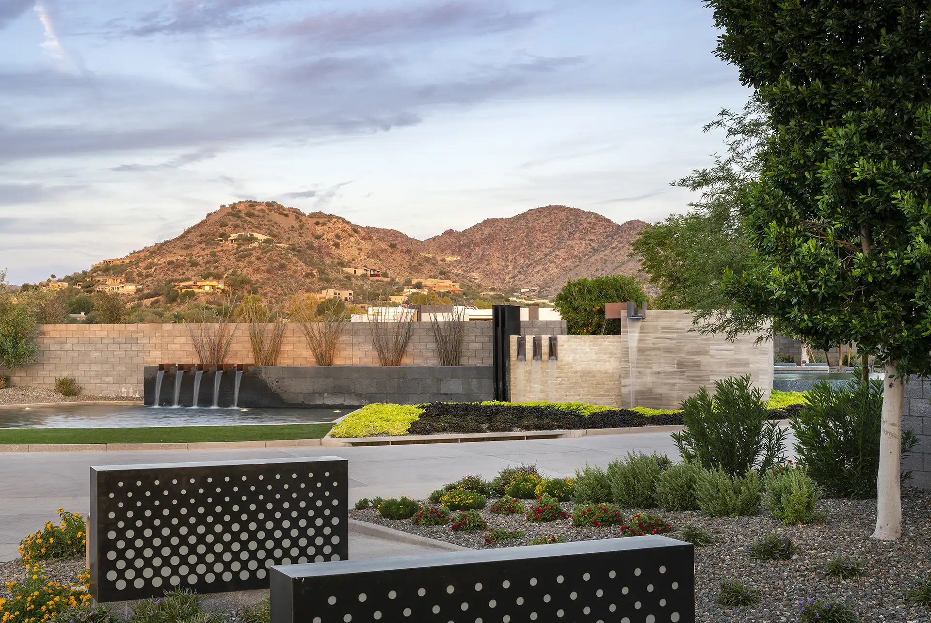 In Scottsdale, Arizona, Creative Environments designed The Azure as a tranquil residential oasis with a blue pool, fire pit, and serene landscaping for peaceful relaxation.