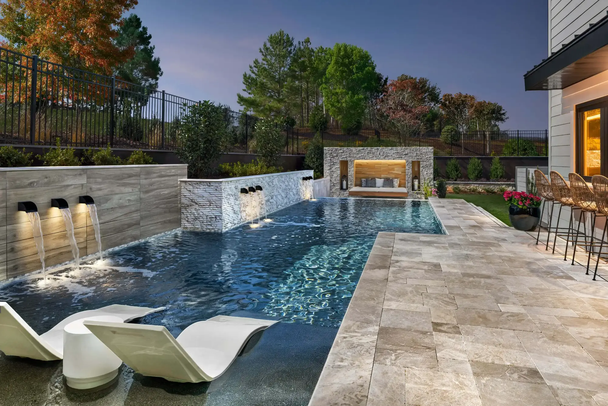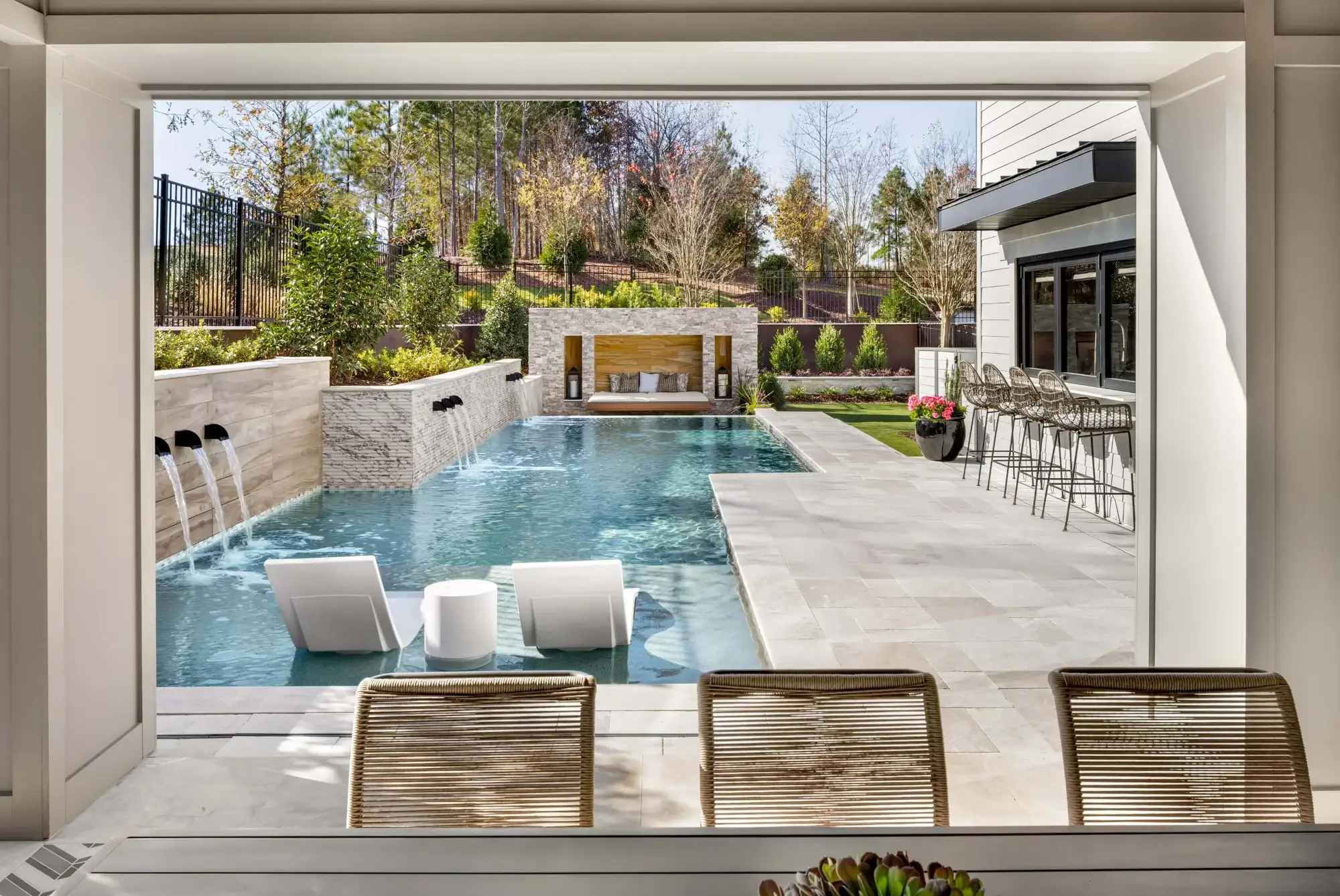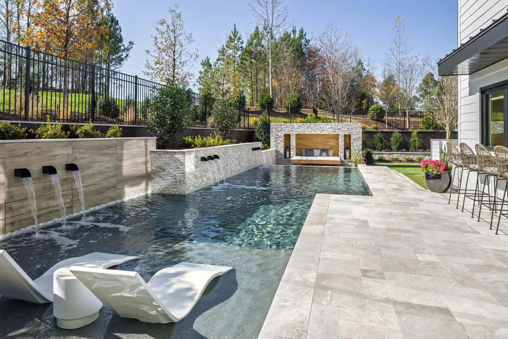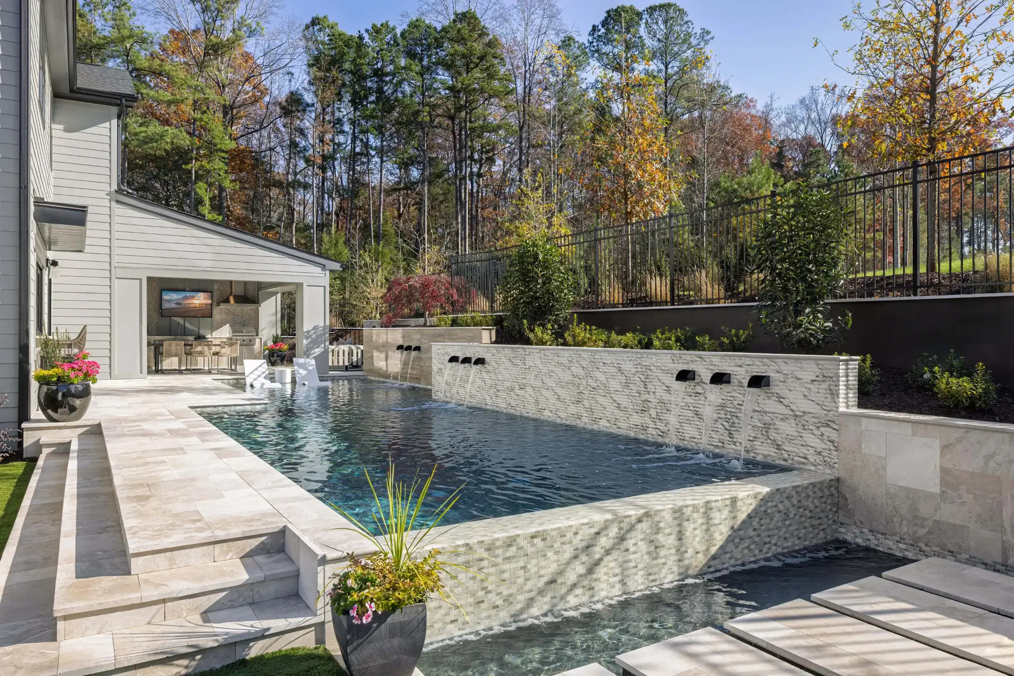 Set against a backdrop of mature trees and gently sloping terrain, The Longleaf Crest transforms a traditional backyard into a contemporary outdoor sanctuary. The design centers around a striking, linear pool framed by textured stone, porcelain pavers, and architectural water walls that introduce both movement and sound. Every detail, from the shallow sun shelf to the integrated lounge niche, was thoughtfully curated to create dimension, comfort, and visual impact.