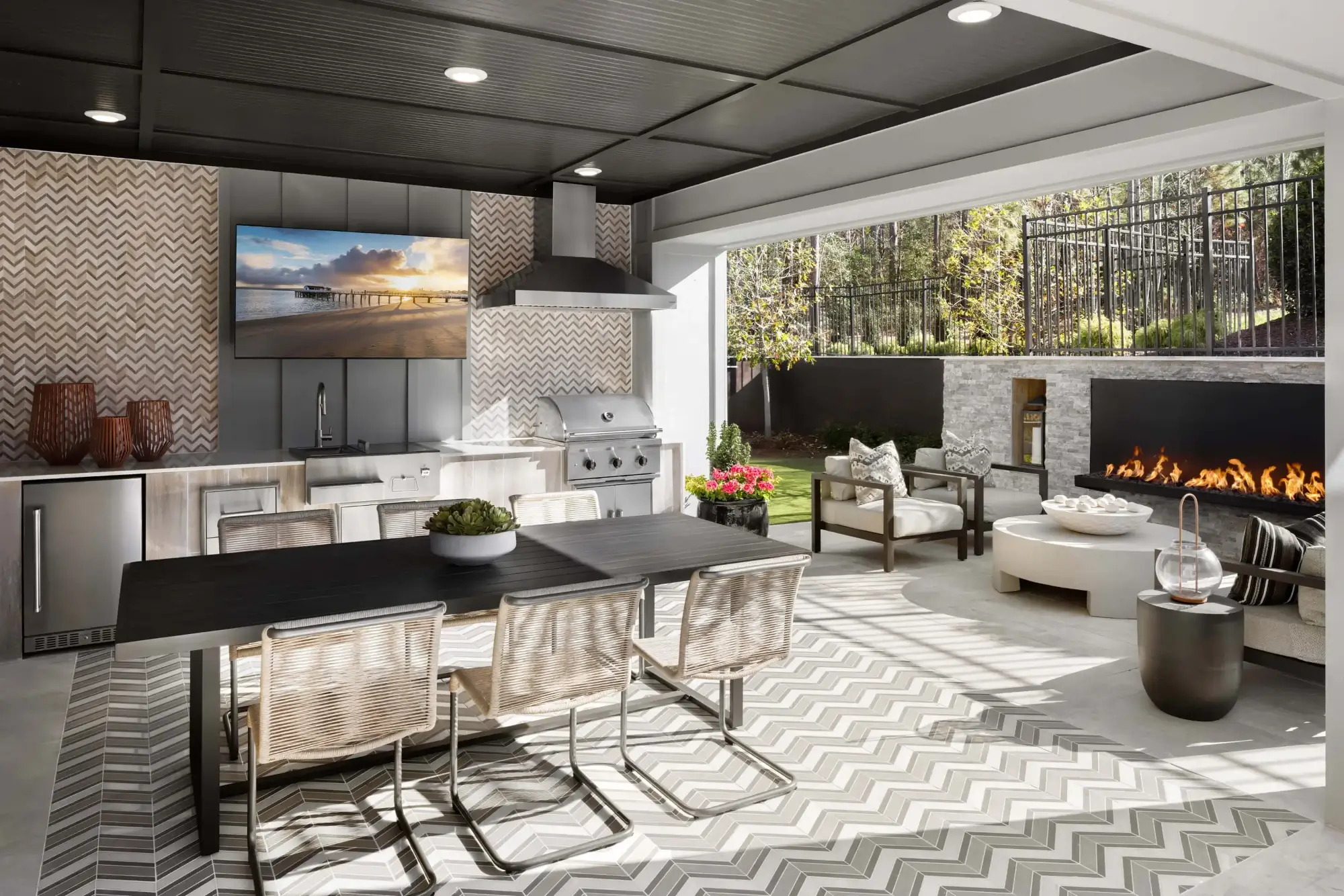 Adjacent to the pool, a fully appointed covered terrace extends the home’s living space outdoors. A modern outdoor kitchen, dining area, and fireside lounge create a seamless environment for hosting, while landscape enhancements soften the hardscape with layered greenery and seasonal color. By day, the space feels bright and open; by evening, strategic lighting highlights water features and architectural elements, delivering a warm, elevated ambiance.