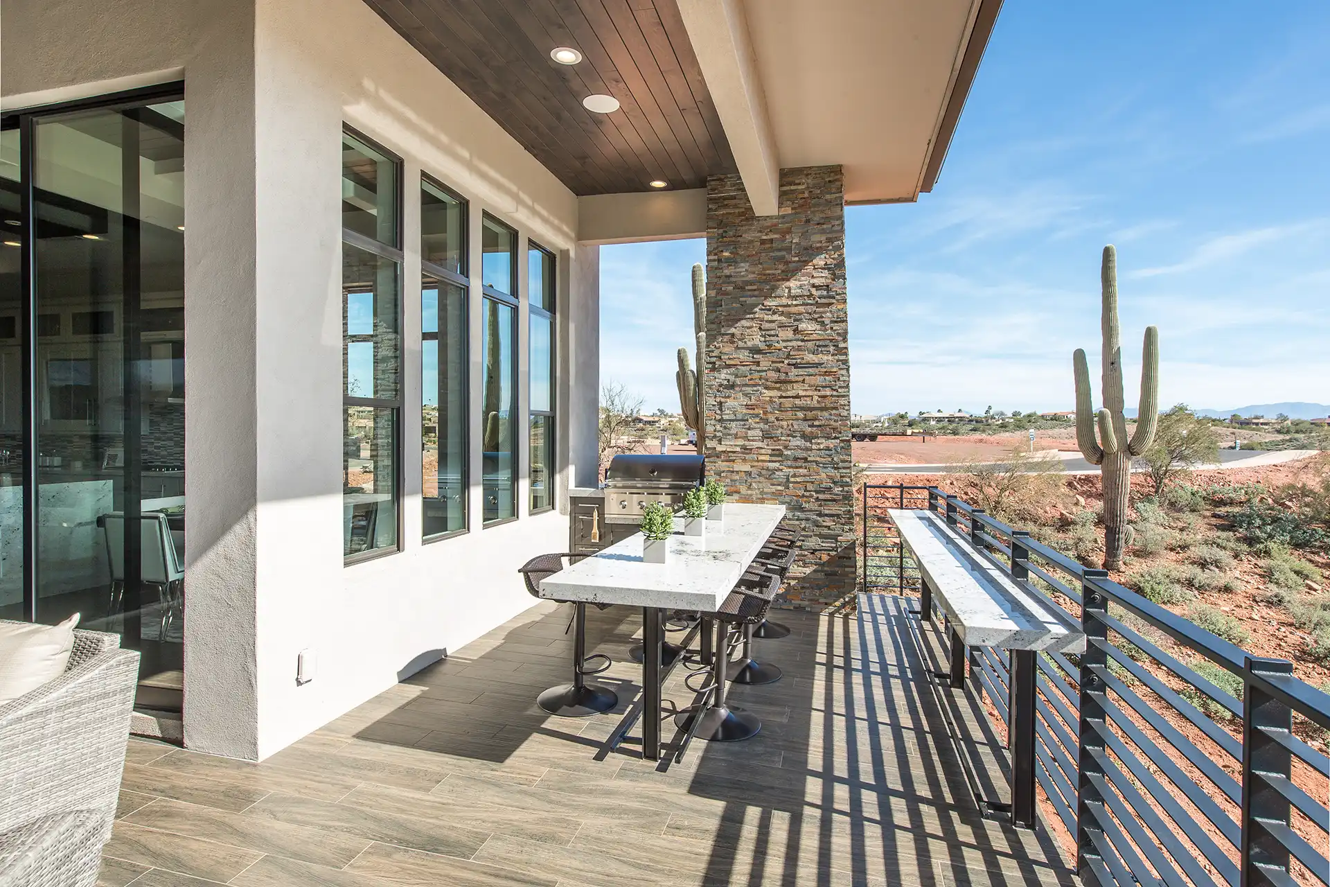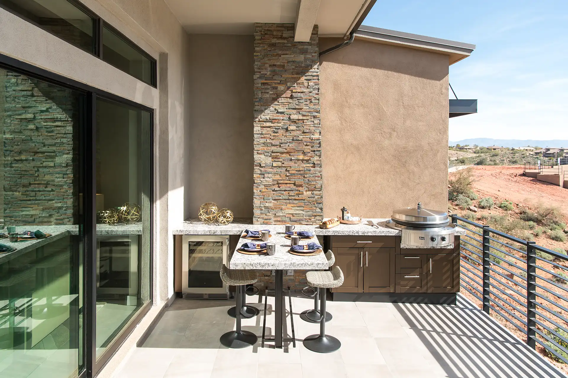 – Outdoor kitchen and bar seating.