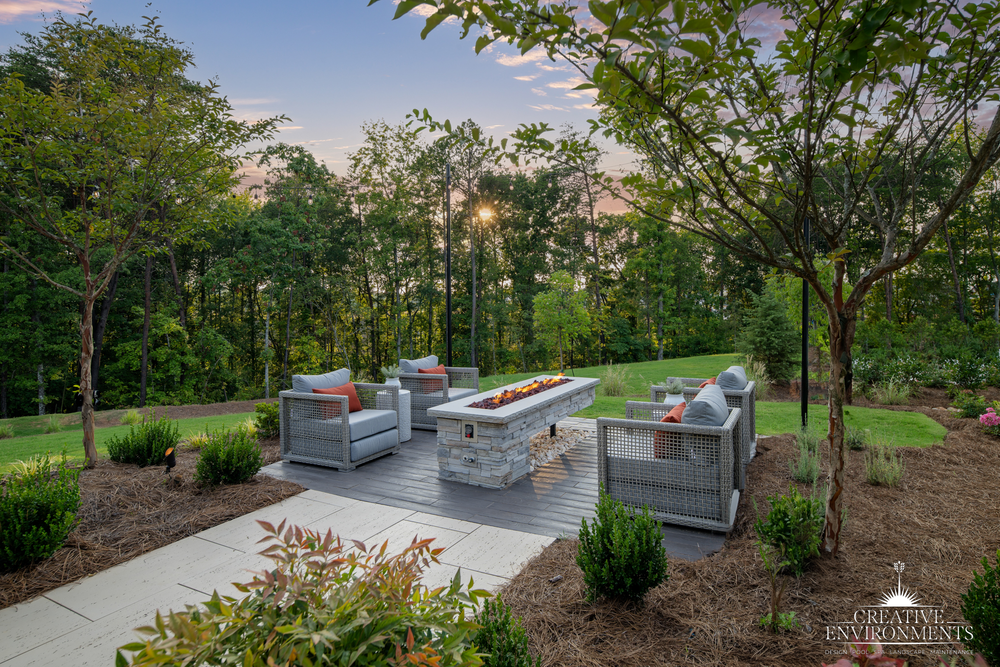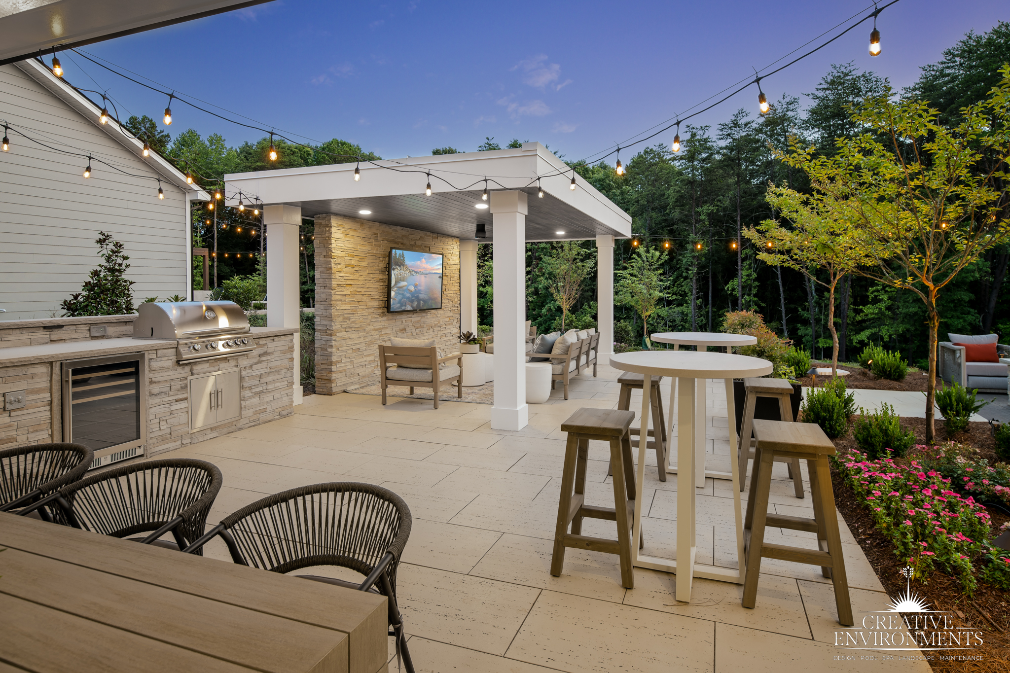 Creative Environments has crafted a space that feels crisp, clean, and low-maintenance — a perfect match for the home’s modern-farmhouse charm. The design centers on a large, light-toned patio that extends the home’s footprint into a functional outdoor living area. This space relies on refined simplicity: open gathering zones, sculptural planting, and architectural lighting that brings elegance and ease to every evening.