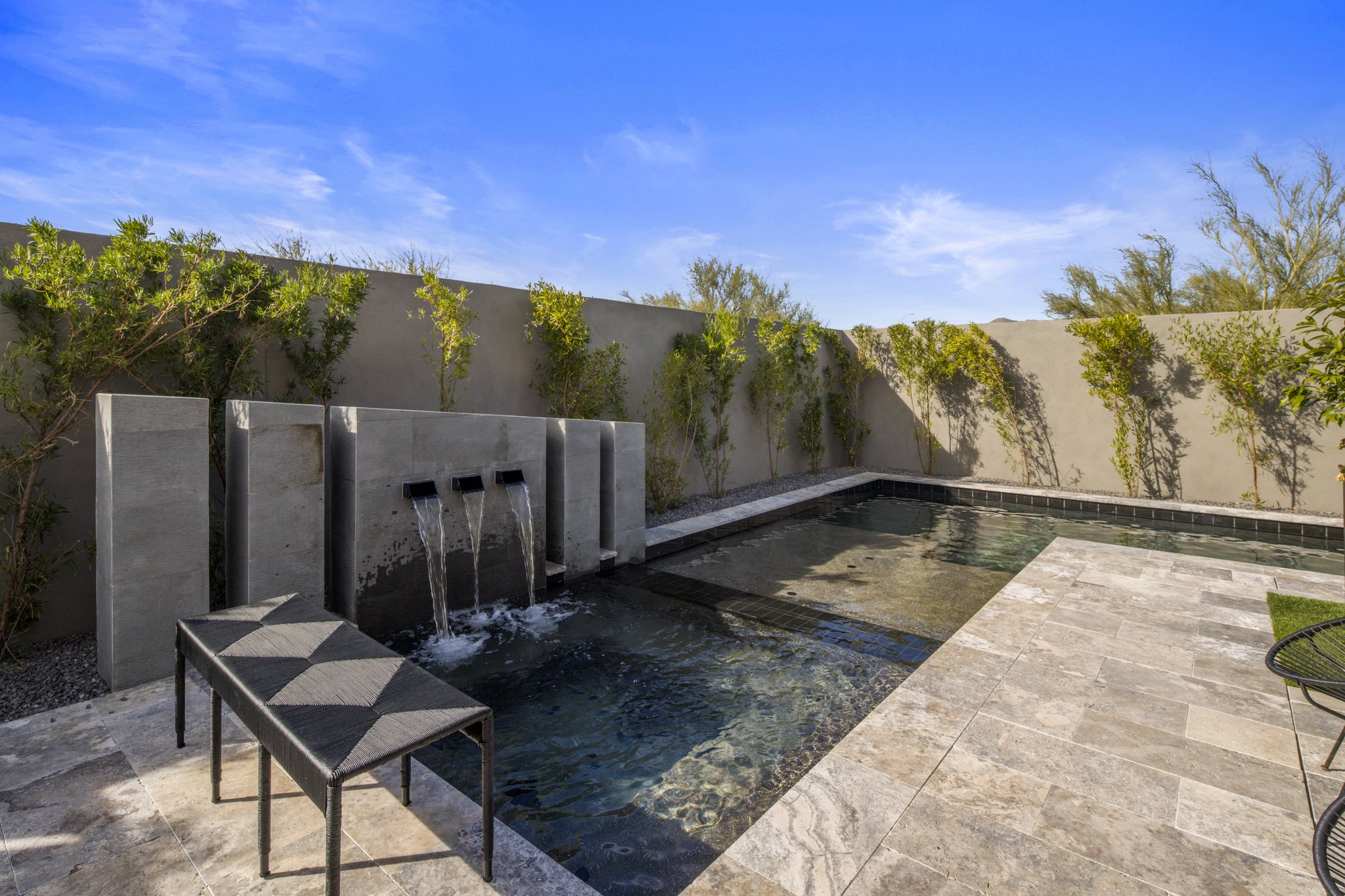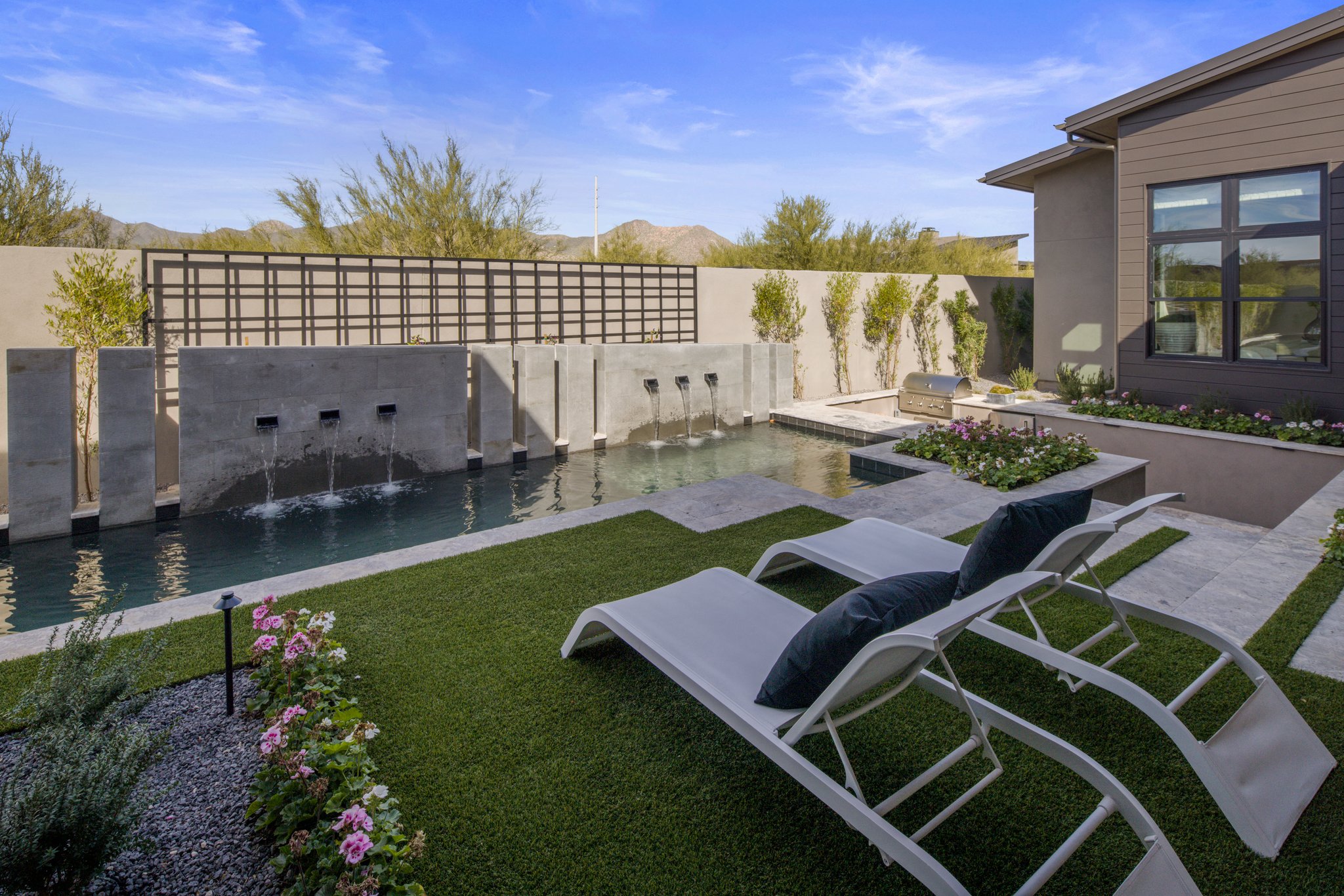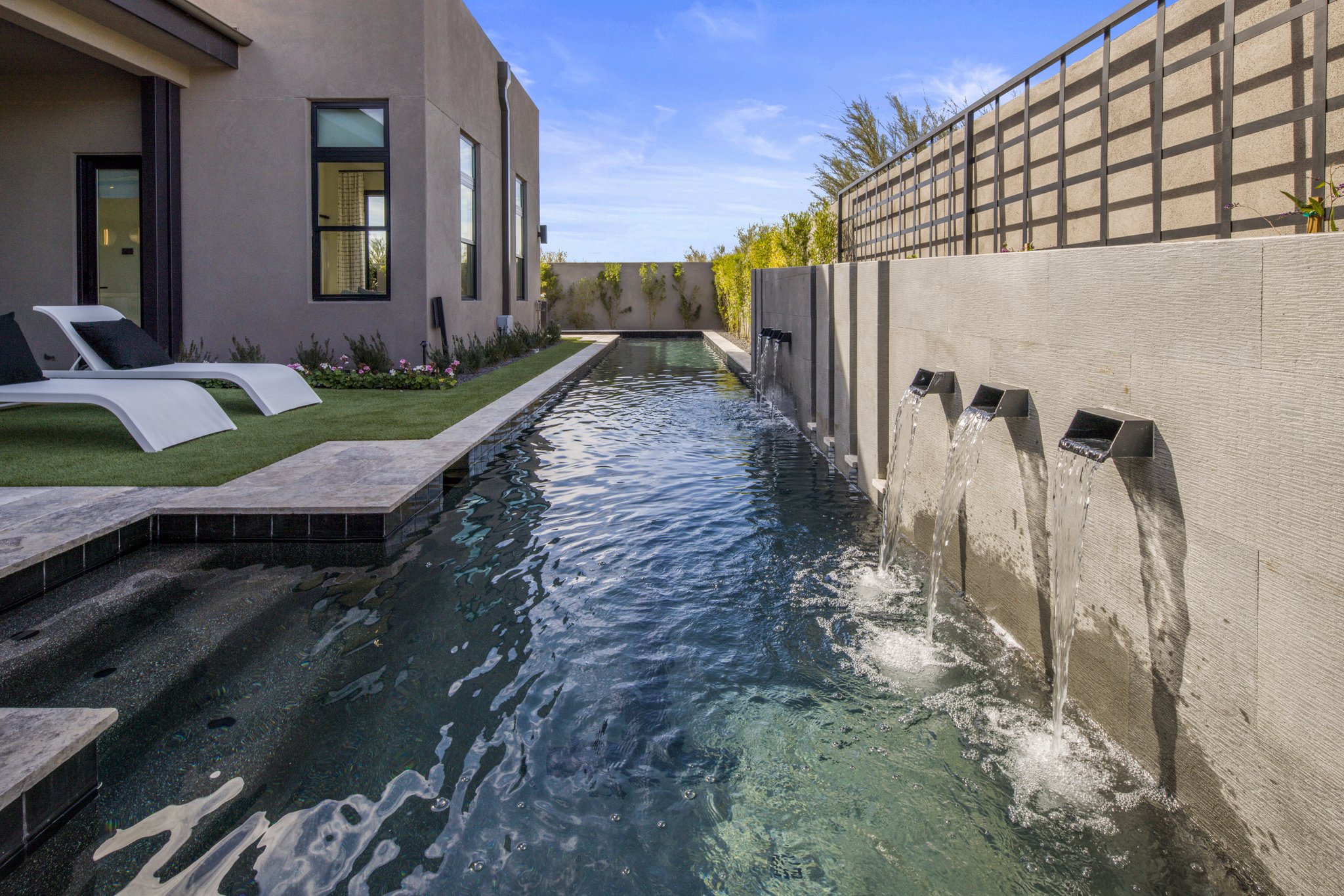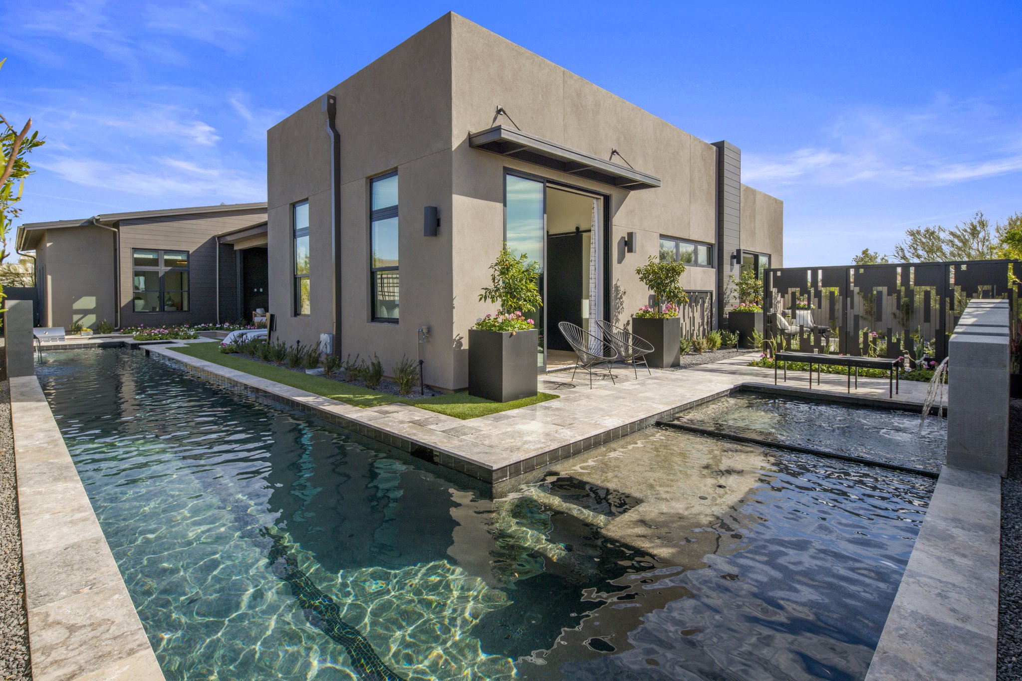 -Geometric pool that wraps around the backyard